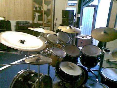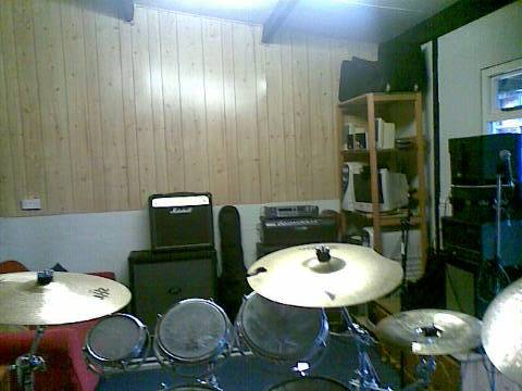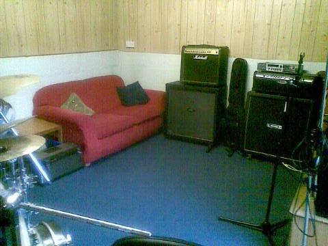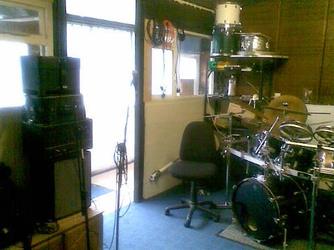 The live room is a comfortable size - 5.5 metres by 3.5 metres and great for rehearsals for all types of bands. The lower half of room is stone (ok, breezeblock), the upper half wood, and provides a great sound for recording live drums as we've recently discovered. Various backline is available including drums, amps and a basic 6 channel PA.